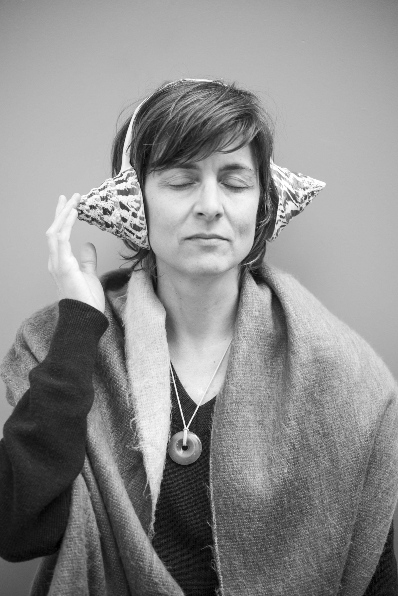 B&W image: Listening through Bert Theis’ F.M.1, F.M.2, F.M.3, F.M.4, F.M.5, 1999 installation at MUDAM Luxembourg. Photo made by David Berg.